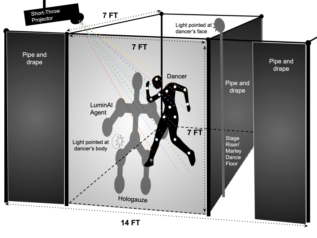 LuminAI employs a five-module pipeline for perception, movement segmentation, learning, transformation, and response generation. Using motion capture and Laban Movement Analysis, the AI analyzes and responds to human movements, creating a dynamic co-creative experience. The design integrates lightweight, portable components, including Hologauze projection technology, to ensure accessibility and adaptability for public exhibitions.