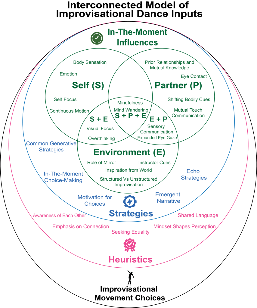 Focus groups with 24 university-level dance students examined improvisational dynamics through thematic analysis. The study synthesized findings into an Interconnected Model of Improvisational Dance Inputs, addressing in-the-moment influences, generative strategies, and heuristics for collaboration. This human-centered approach ensures LuminAI aligns with dancers’ needs and practices.