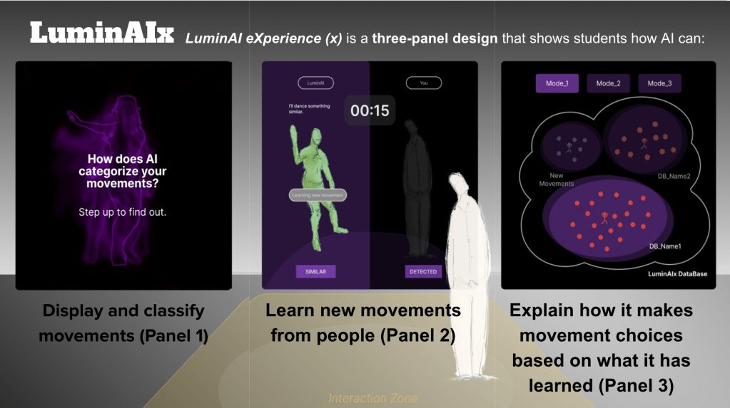 The redesigned LuminAI features three panels, each with specific learning objectives. Panel 1 teaches participants how movement data is represented by AI, Panel 2 focuses on co-creative improvisation with an AI dance partner, and Panel 3 visualizes how AI clusters similar movements. This modular design ensures accessibility for middle-school-aged participants and broader public audiences, with simplified terminology and structured prompts tailored for informal learning environments.